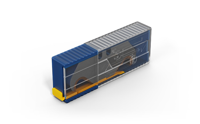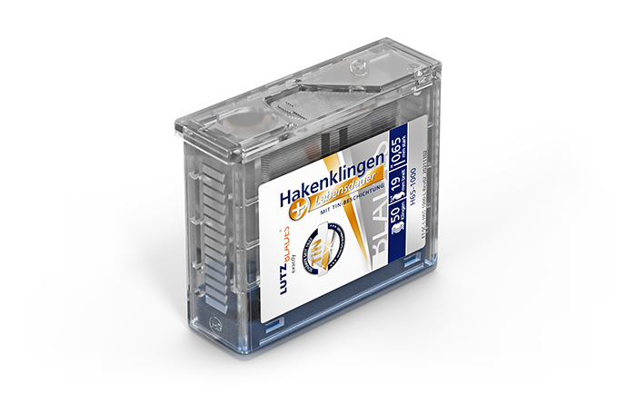 The LUTZ packaging and dispenser solutions have been individually developed for every blade shape, whether hook, trapezoidal snap-off or 3-hole blade, and can be used variably for various filling quantities. Thanks to special mechanisms, LUTZ blade dispensers meet the highest safety requirements.