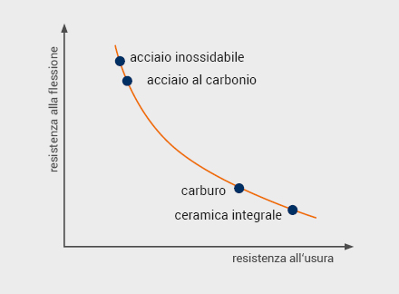 Confrontando le lame in acciaio al carbonio o acciaio inossidabile con quelle in metallo duro o ceramica integrale, si notano differenze significative nelle proprietà. Entrambi i tipi di materiali hanno specifiche particolari che, se utilizzate correttamente, offrono notevoli vantaggi tecnici di produzione per l’utente. Considerando la resistenza alla flessione positiva delle lame in acciaio al carbonio, questo materiale è particolarmente adatto per applicazioni manuali grazie alla sua flessibilità, come ad esempio nelle lame fai-da-te. In questo caso, il metallo duro e la ceramica sono chiaramente meno attrezzati a causa della loro struttura chimica. L’uso di metallo duro o ceramica integrale può tuttavia esprimere i suoi punti di forza unici in termini di durata in molti settori di applicazione con lame guidate a macchina. Inoltre, il materiale ceramico integrale eccelle in modo significativo nella resistenza alla temperatura fino a 600 °C. La ceramica integrale non è solo particolarmente resistente al calore, ma ha anche un’elevata resistenza all’ossidazione e non è conduttiva.